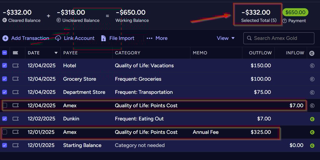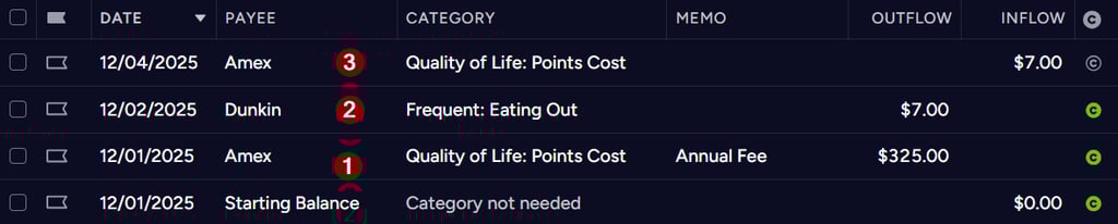 This step is broken into topics, but it's important to note that I don't address the less tangible perks like free lounge access, free breakfasts or no carry-on baggage fees. I also do not recommend tracking your points in YNAB, because of the variability of the "value" of those points, and it artificially inflates your overall net worth. Plus, there are other apps dedicated to that task.