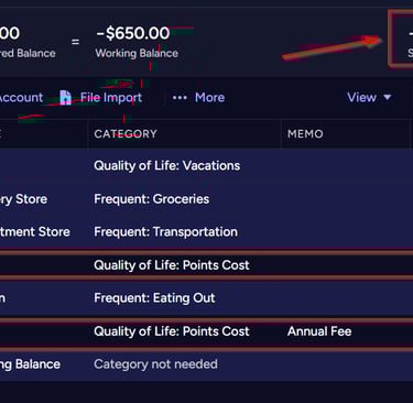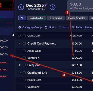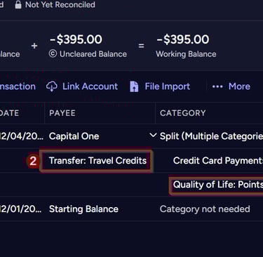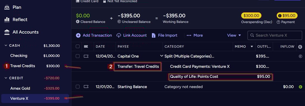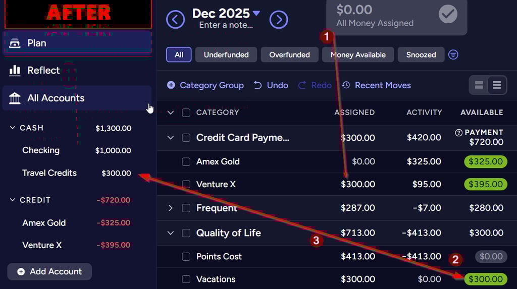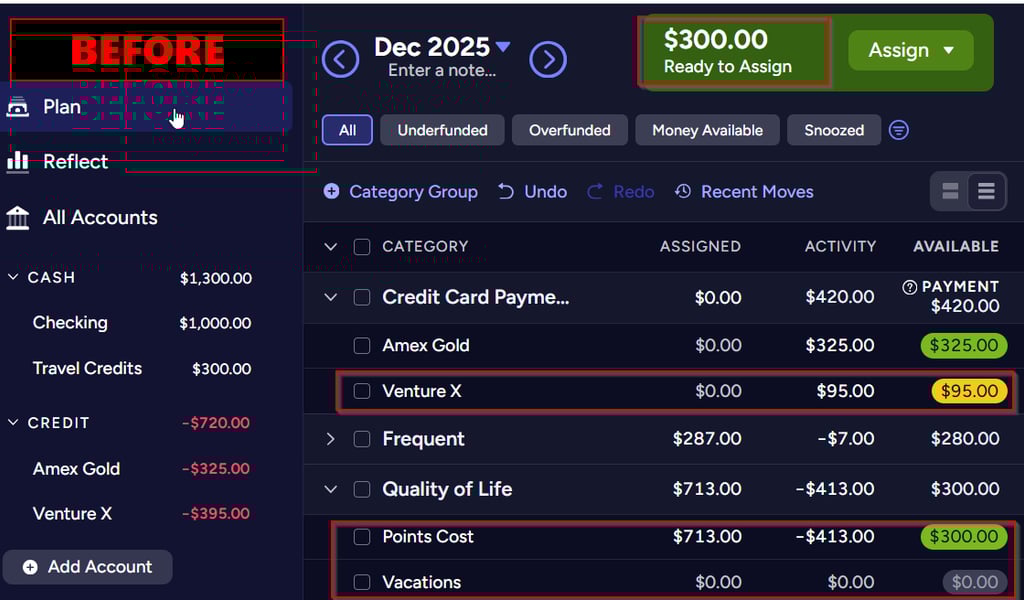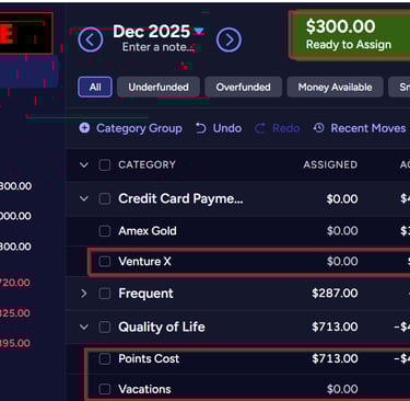 Second, move the extra money from the Points Cost to the Vacations category (or whatever category you will spend your travel credit from. You may want a specific "Venture X Travel Credit" category just for this.)