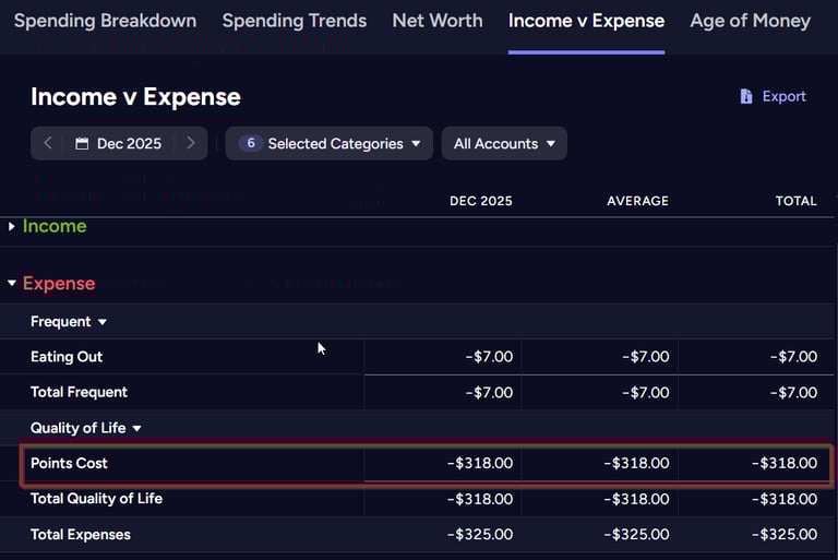 At the end of the year (or ahead of a big trip), open YNAB’s Reflect tab and look at your "Income Vs Expense" report. Filter by the Categories: Points Cost and Vacations (or whichever categories you set up)